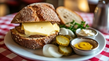 Despite the name, there's no half rooster here, but rather a rye roll with a thick slice of medium-aged Gouda cheese, mustard, onions, and sometimes cucumber.