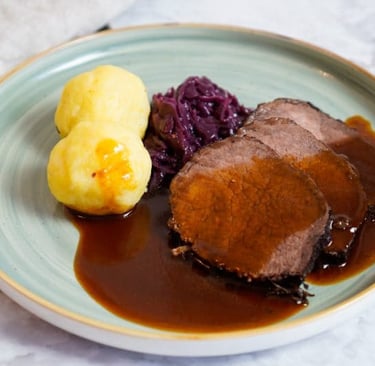 Traditionally, horse meat was used, but today it's mostly beef. Served with red cabbage and potato dumplings.